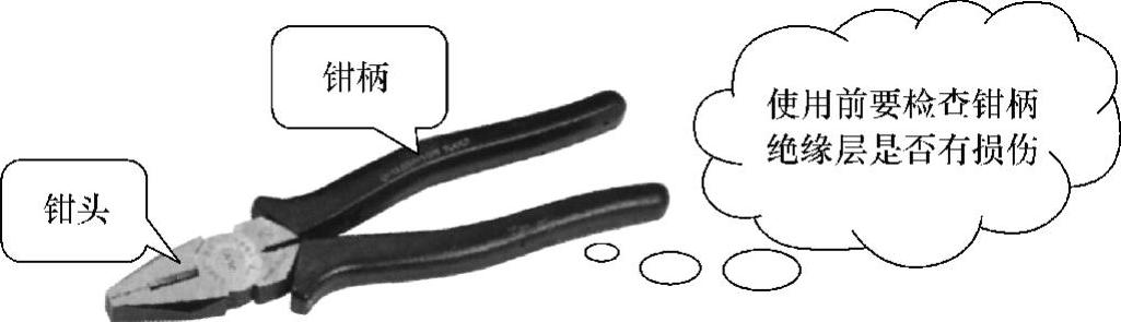 (1)在使用前,禁忌不检查电工钳钳柄的绝缘层是否良好,否则带电作业时手接触钳柄破损处,容易造成触电事故,如图1-5所示。