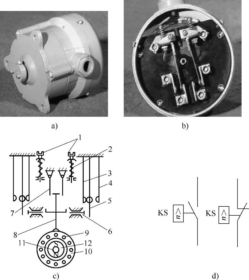 a)外形 b)内部结构 c)内部结构示意图d)符号 1—调节螺钉 2—反力弹簧 3—动断触点 4—动合触点 5—动触点6—推杆 7—返回杠杆 8—摆杆 9—笼型导条 10—圆环 11—转轴 12—永磁转子