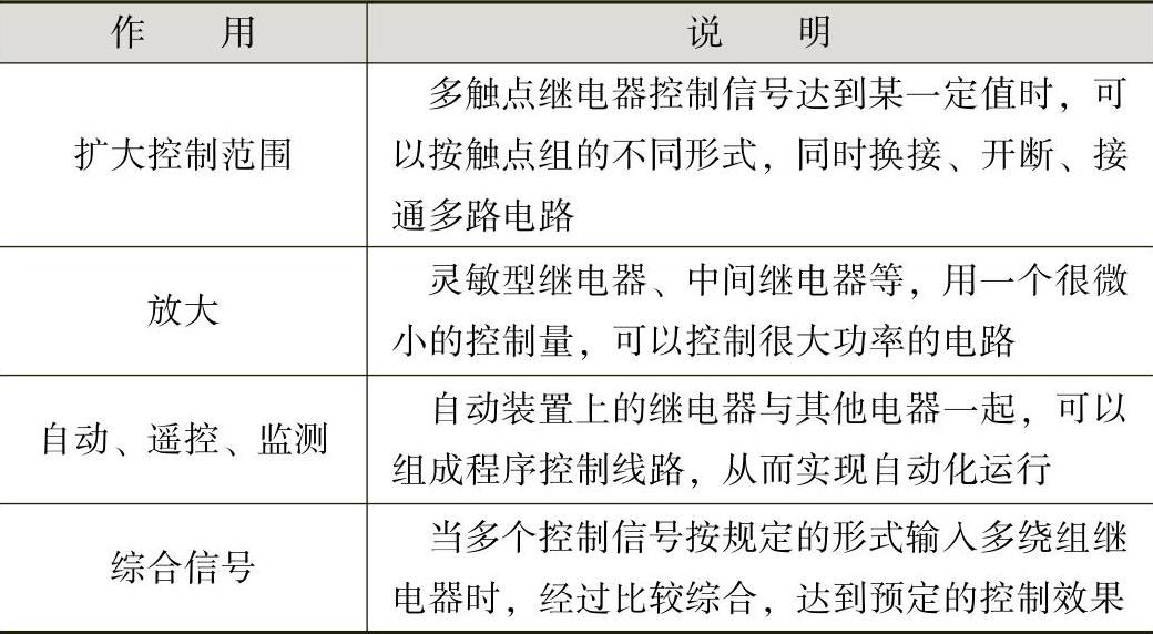 一般来说,继电器主要用来反映各种控制信号,其触点通常接在控制电路中,不直接控制电流较大的主电路,而是通过接触器或其他电器对主电路进行控制。作为控制元件,概括起来,继电器的作用见表2-1。