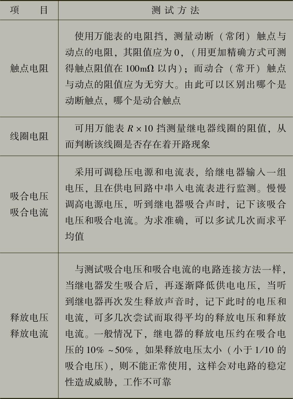 在安装、维护、维修继电器时,可通过对继电器的一些参数进行测试,以鉴定其质量好坏,其参数项目见表2-4。
