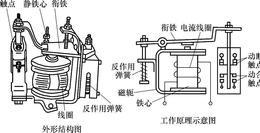 过电流继电器正常工作时线圈中虽有负载电流,但衔铁不产生吸合动作;当出现超出整定电流的吸合电流时,衔铁才产生吸合动作。在电气控制线路中出现冲击性过电流故障时,过电流使过电流继电器衔铁吸合,利用其动断触点断开接触器线圈的通电回路,从而切断电气控制线路中电气设备的电源。JT4系列过电流继电器的结构及原理如图2-1所示。