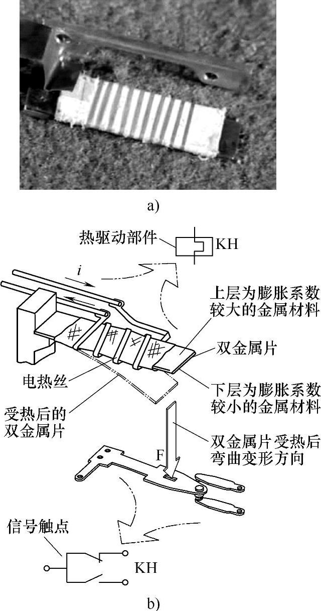 热继电器的基本工作原理是利用两种金属的热膨胀率差异以及电流的热效应共同构成一个由于电流超限使触点动作的装置,即电流→热量→金属热膨胀→弯曲变形→位移→触点动作,如图2-6所示。