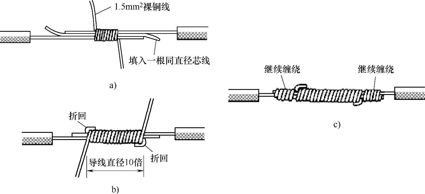 常用的单股铜芯线有6mm 2 及以下的小截面积单股铜芯线和6mm 2 以上的大截面积单股铜芯线,其连接方法见表2-14。