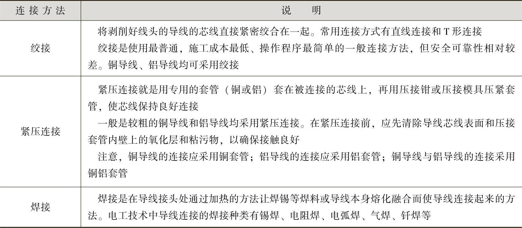 连接的导线种类和连接形式不同,其连接的方法也不同。常用的连接方法有绞接、紧压连接、焊接等,见表2-11。