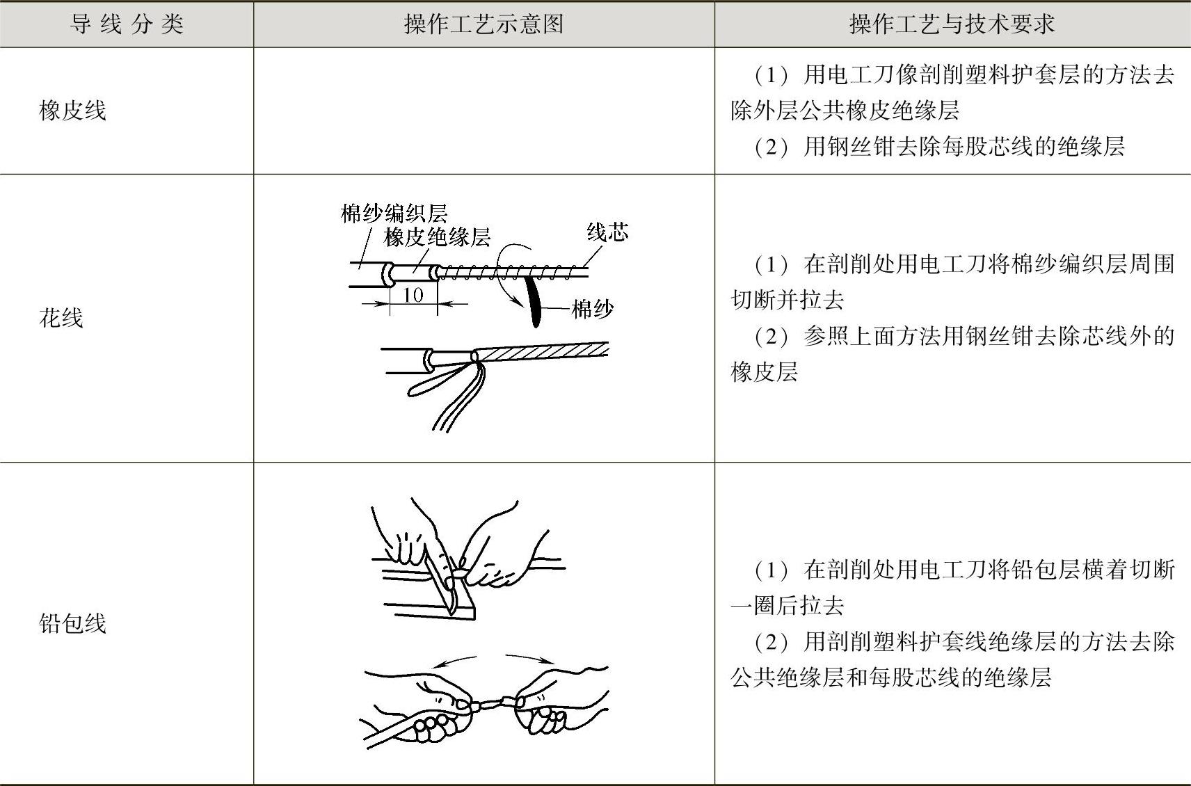 表2-10 导线线头绝缘层的剥削工艺与技术要求