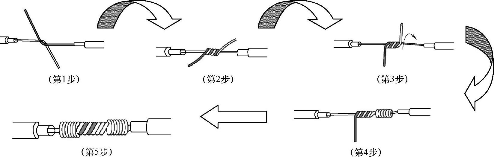 把细导线在粗导线上缠绕5~6圈后,弯折粗导线端部,使它压在细线缠绕层上,再把细线缠绕3~4圈后剪去多余细线头,如图2-23所示。