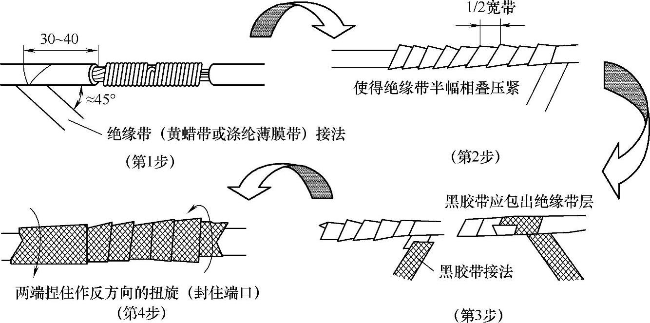 导线连接后,必须进行导线绝缘层的恢复工作。导线绝缘恢复的基本要求为绝缘带包裹均匀、紧密,不露铜芯。