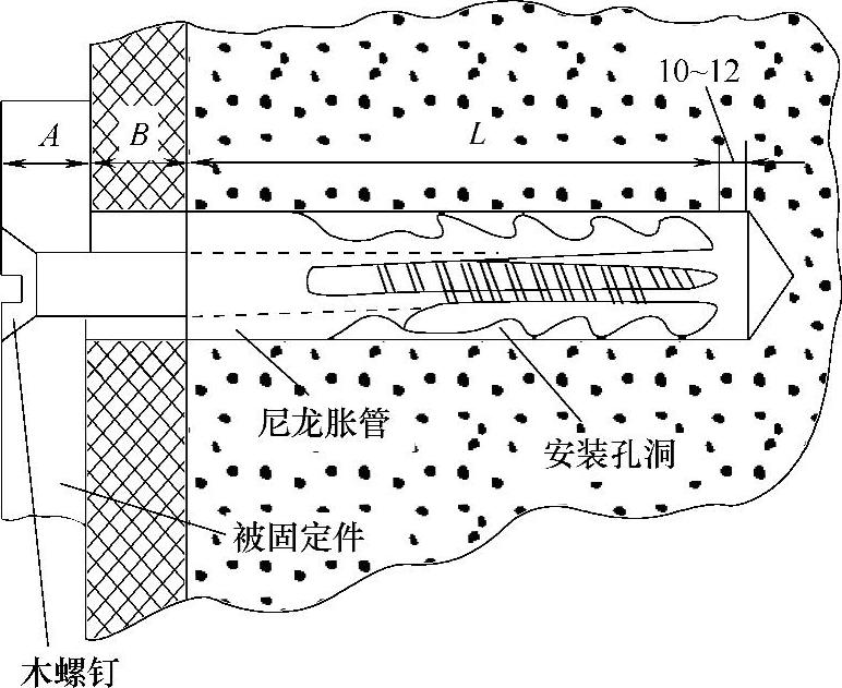 尼龙胀管安装示意图如图3-5所示。图中,A为被固定件厚度,单位为mm;B为尼龙胀管深入墙壁的深度;L为尼龙胀管长度,单位为mm。