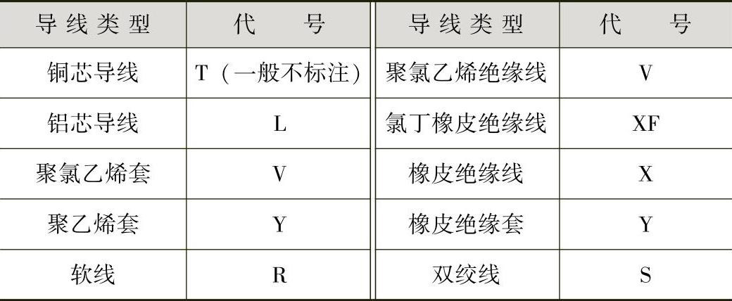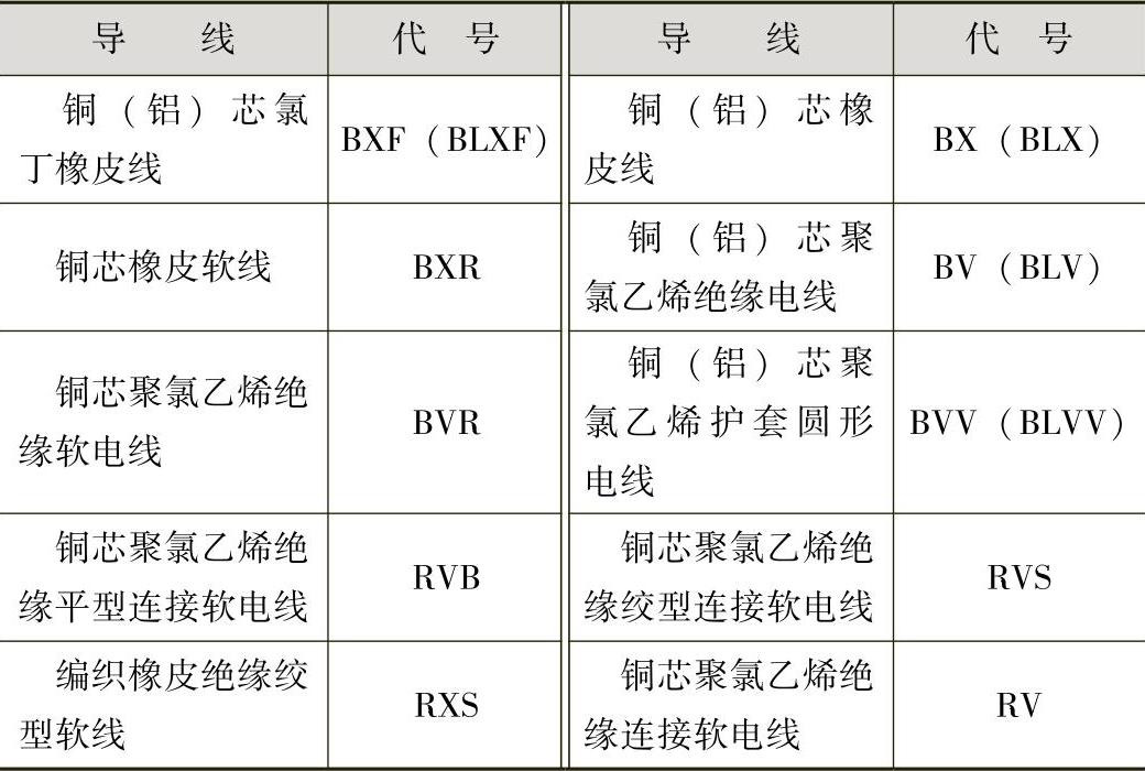 内线敷设所使用的导线主要有BV型和BLV型塑料绝缘导线(BV型为铜芯,BLV型为铝芯);BX型和BLX型是橡皮绝缘导线(BX型为铜芯,BLX型为铝芯);BVV型是塑料护套硬导线,板面型号中第二个V表示在塑料线外面又加一层塑料护套;RVV型是塑料护套软线,护套线大多是多芯的,有二芯、三芯、四芯等多种;RVB型和RVS型是塑料软导线,型号中R表示软线,B表示两根线粘在一起的并行线,S表示双绞线。