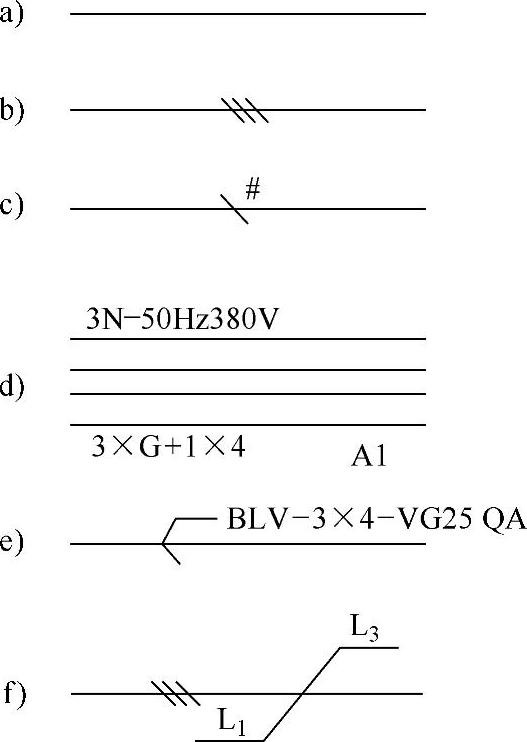 需要表示导线的特征(如导线的材料、截面、电压、频率等)时,可在导线上方、下方或中断处采用符号标注,如图1-1d、e所示。