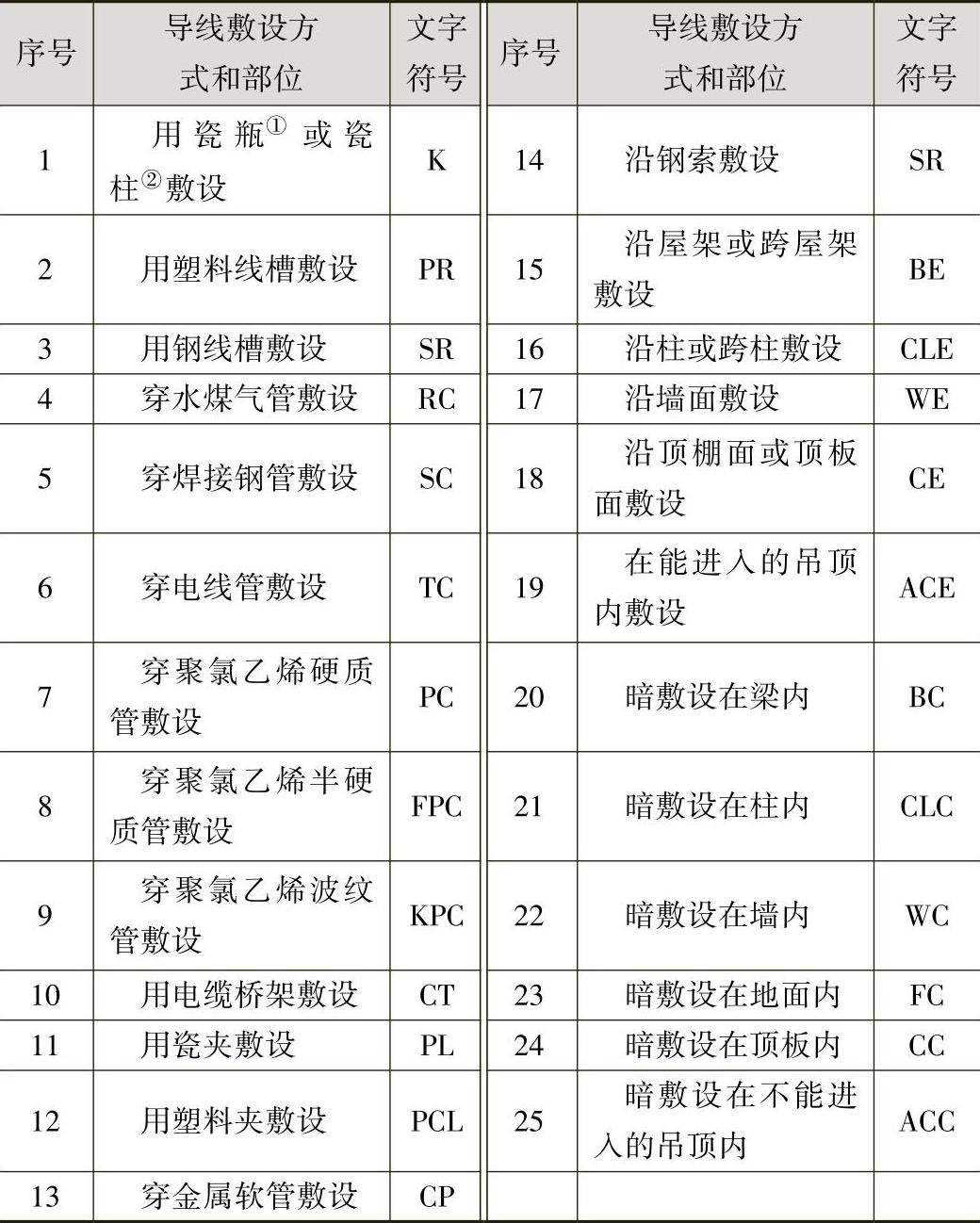 工程图中导线的敷设方式及敷设部位一般用文字符号标注,见表1-2。表中代号E表示明敷设,C表示暗敷设。