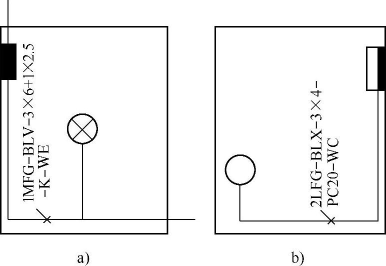图1-2b中,线路标注“2LFG-BLX-3×4-PC20-WC”的含义是:2号动力分干线(2LFG);铝芯橡皮绝缘线(BLX);3根导线截面积均为4mm 2 (3×4);穿直径为20mm的硬塑料管(PC20);沿墙暗敷(WC)。