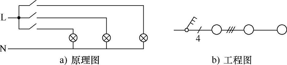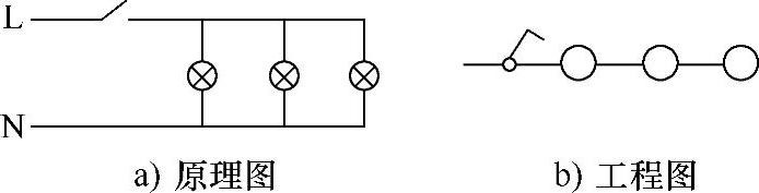 (2)一个开关控制多盏灯的表示法,如图1-4所示。