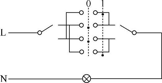 (3)三个双控开关控制一盏灯。三地控制线路与两地控制的区别是比两地控制又增加了一个双控开关,通过位置0和1的转换(相当于使两线交换)实现三地控制,如图1-8所示。