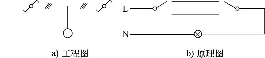 (2)两个双控开关控制一盏灯。电路中要使用双控开关,开关应接在相线上,当开关同时接在上或下的位置即接通电路,只要开关位置不同则电路断开。两个双控开关控制一盏灯的表示法,如图1-7所示。
