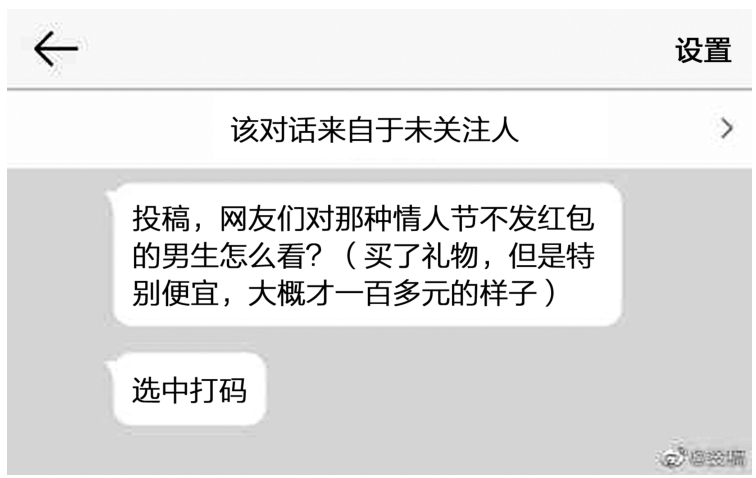 微博内容是“怎么看待情人节不发红包,买了很便宜的礼物的男生?”,下面附上用户的私信。