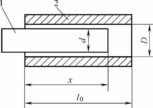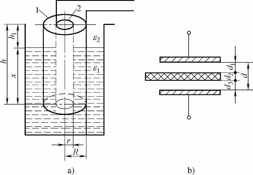 图1-26a中由圆筒1和圆柱2构成电容器两极,假定部分浸入被测量液体中(液体应不能导电,若能导电,则电极需作绝缘处理)。这样,极板间的介质由两部分组成:空气介质和液体介质。由此而形成的电容式料位传感器,由于液体介质的液面发生变化,从而导致电容器的电容量 C 也发生变化。这种方法测量的精度很高,巨不受周围环境的影响。总电容量 C 由液体介质部分电容 C 1 和空气介质部分电容量 C 2 两部分组成:
