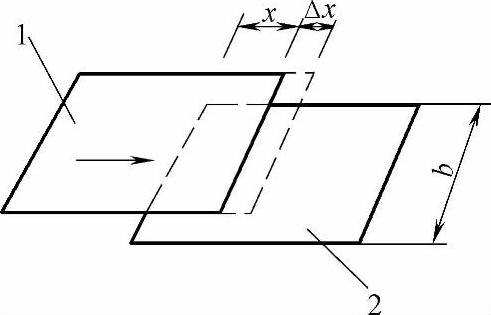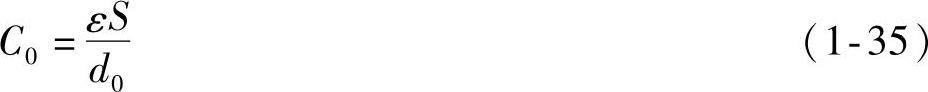 图1-27是这类传感器的原理图,图1-27a由两块极板构成,其中极板2为固定极板,极板1为与被测物体相连的活动极板,可上下移动。当极板间的遮盖面积为 S ,极板间介质的介电常数为 ε ,初始极板间距为 d 0 时,则初始电容 C 0 为
