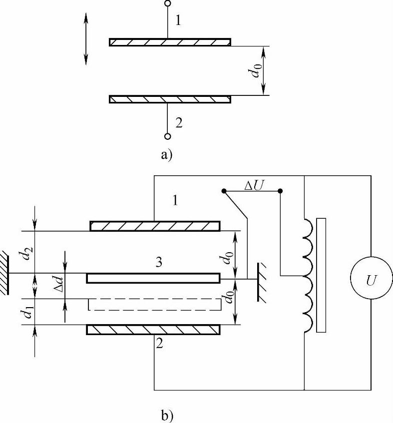 显然,这种单边活动的电容式传感器随着测量范围的增大,相应的误差也增大。在实际应用中,为了提高这类传感器的灵敏度、提高测量范围和减小非线性误差,常将其做成差动式电容器及互感器电桥组合结构,如图1-27b所示。两边是固定的电极板1和2,中间是由弹簧片支承的活动极板3。两个固定极板与互感器两端及交流电源 U 相连接,活动极板连接端子和互感器中间抽头端子为传感器的输出端,该输出端电压Δ U 随着活动极板运动而变化。