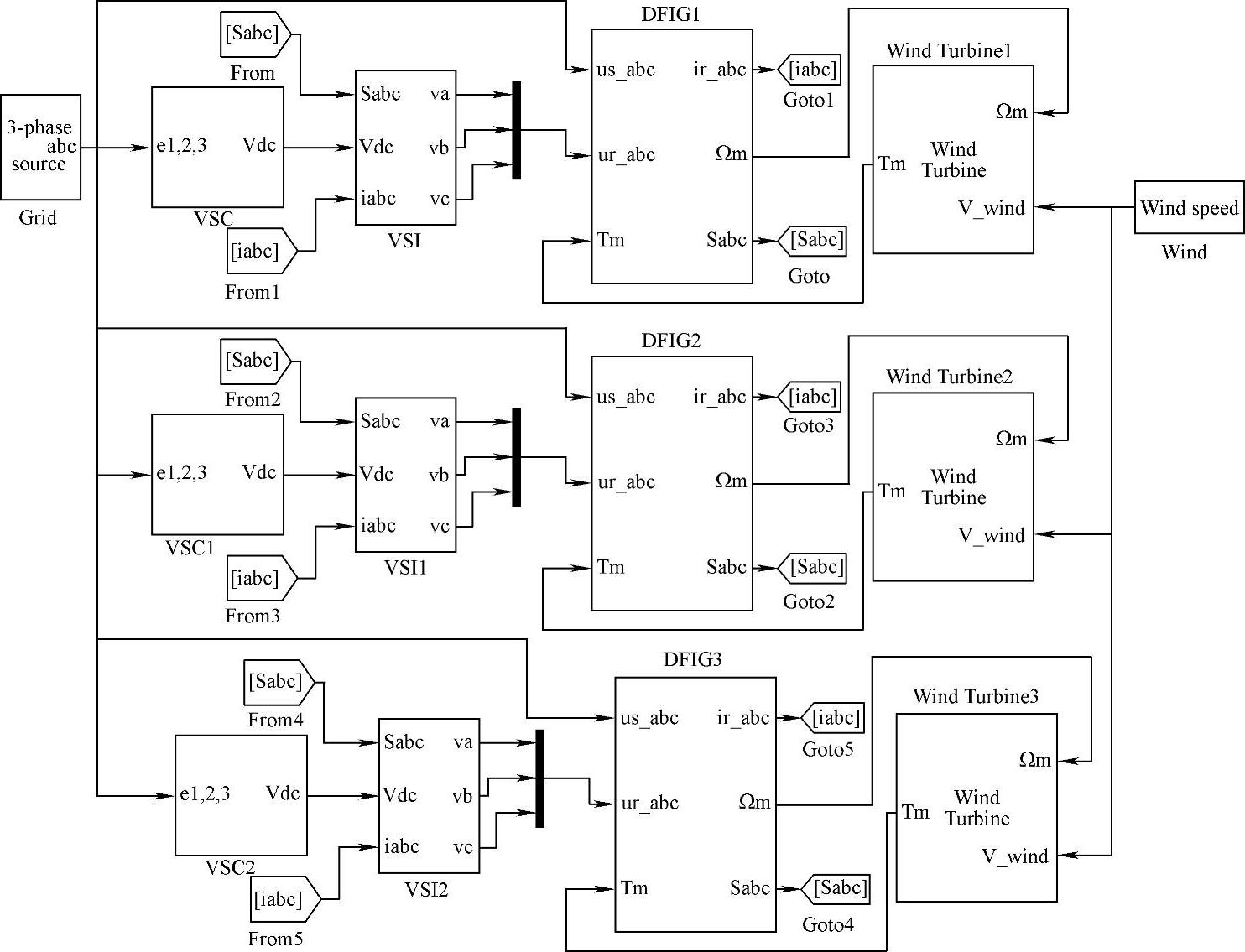 图2-21所示为由三个DFIG背靠背变流器组成的独立的风力发电系统通过级联方式可建立的相应的MATLAB仿真模型,可分别针对转子侧变流器、网侧变流器、DFIG以及风力发电机进行数学建模。