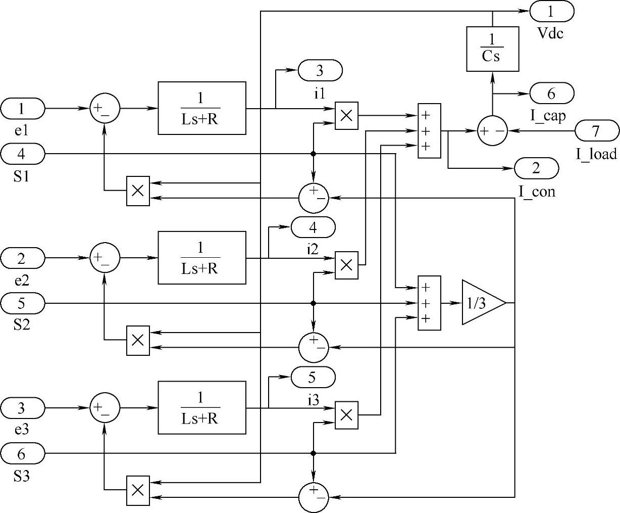 依据式(2-7)和式(2-8)可得图2-23所示网侧变流器的仿真模型。图中,e1、e2、e3和i1、i2、i3分别是交流输入侧三相电压和电流,S1、S2、S3是三相桥臂开关函数,L、R为进线电感和等效电阻,C为直流侧滤波电容, V dc 为输出直流电压,I—con、I—cap、I—load分别为直流侧变流器电流、电容电流和负载电流。