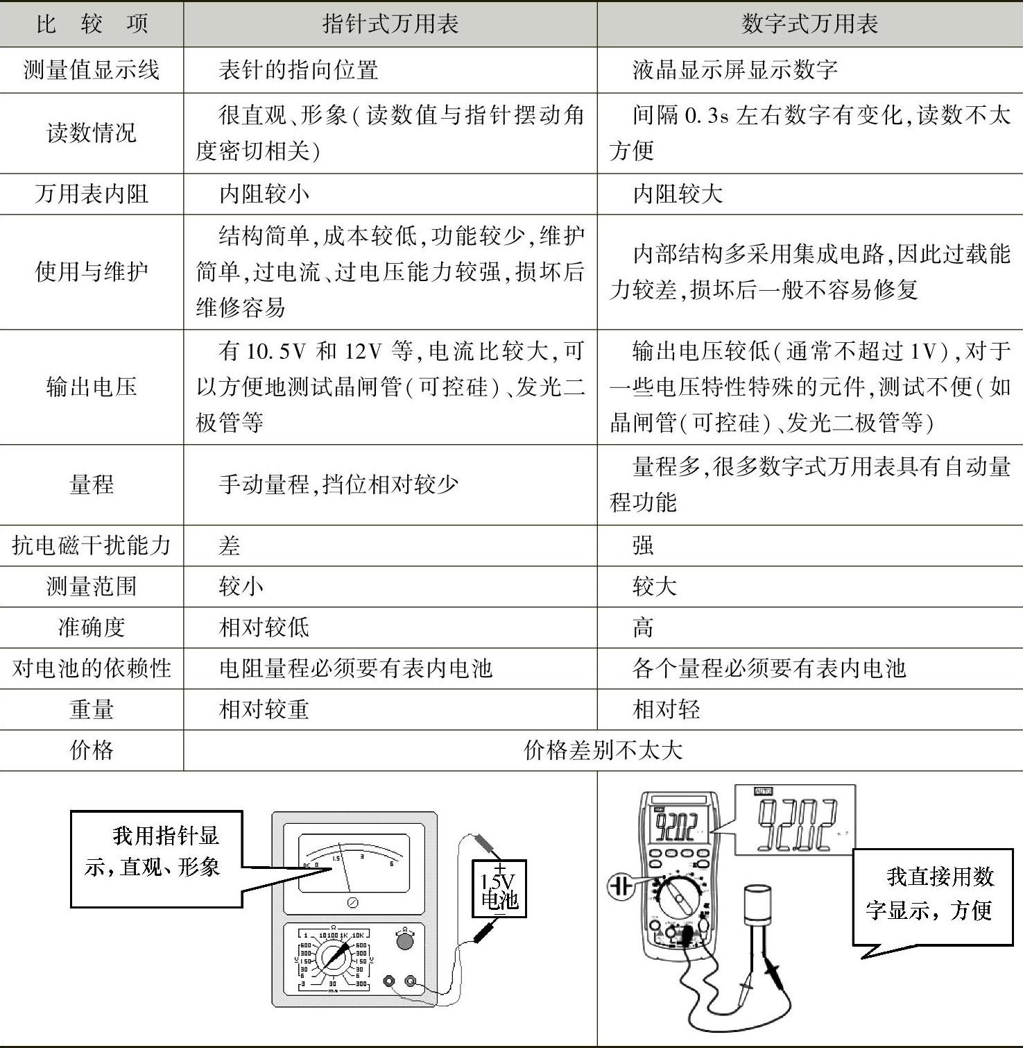 从某种意义上说,万用表是我们的感官的延伸。数字式万用表和指针式万用表的比较见表1-7,它们各有优缺点,很难说谁好谁坏。