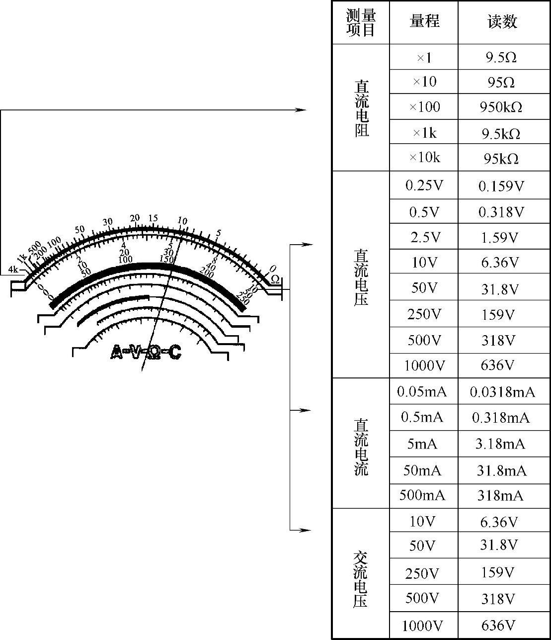例如,指针位于第一条标度尺的9.5,转换开关置于不同量程时,其读数值如图2-11所示。