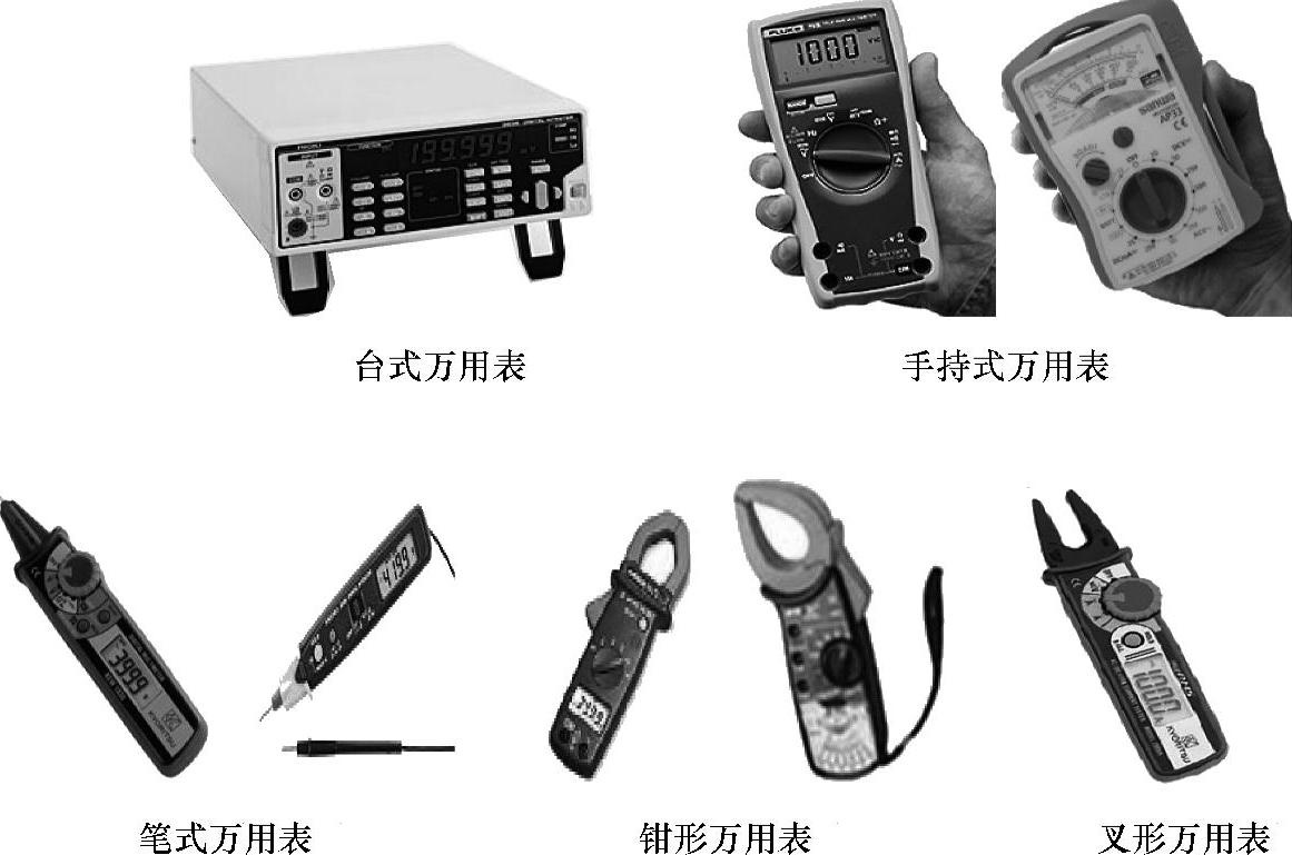 万用表按照外形,可分为台式、手持式、笔式、钳形和叉形等,其体态大小不同,可适应不同工作场合的测量需要(见图1-4)。