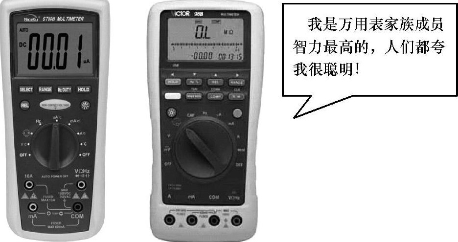 智能型万用表(见图1-7)除了具有多功能型万用表的功能之外,还具有内置交流电压感应测电功能、全保护功能、自动/手动量程随意转换、数据保持功能、℃/℉转换功能、频率/占空比测量功能、自动关机功能等。