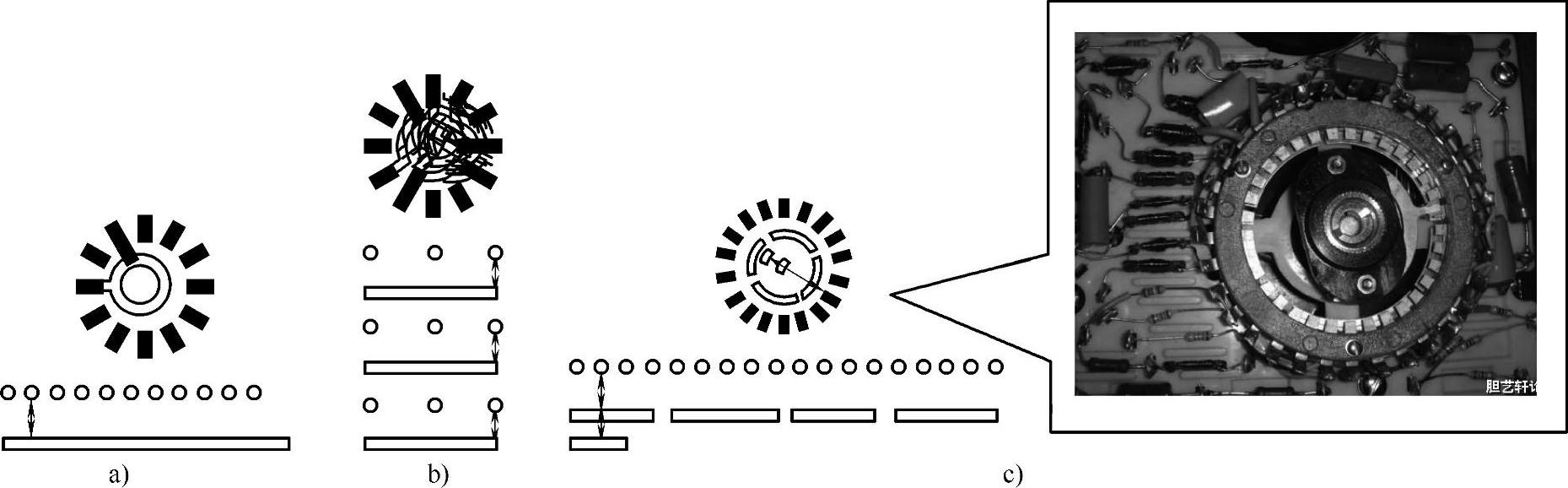 a)单刀11挡转换开关 b)3刀3挡转换开关 c)单刀单层18挡转换开关