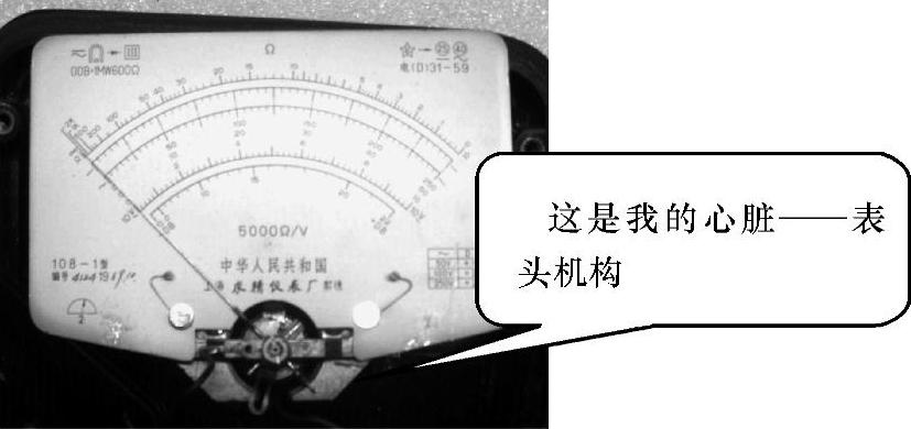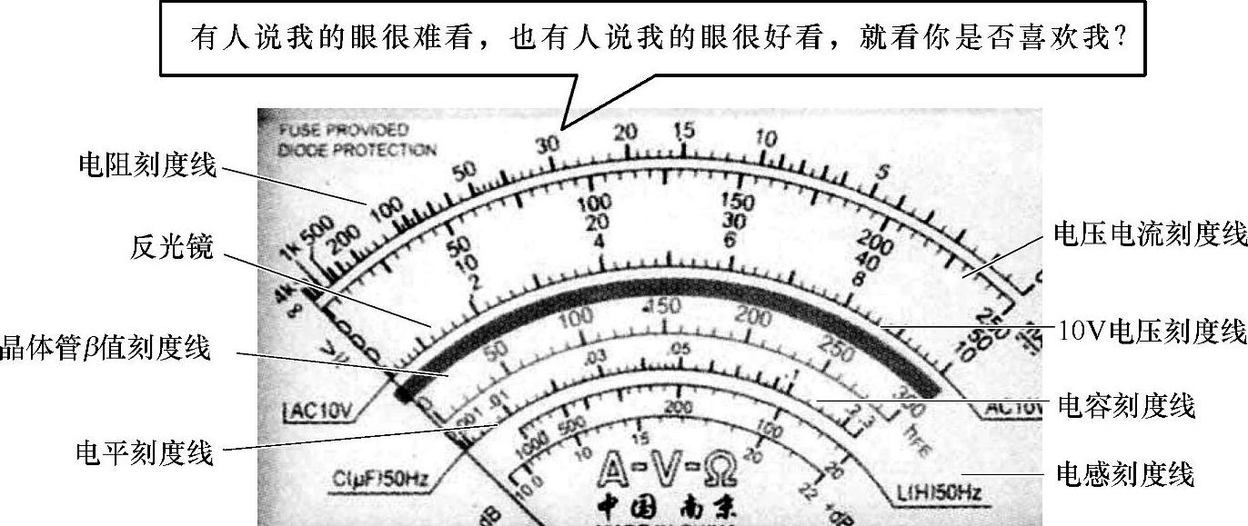 万用表的表盘(见图1-15)上有许多标度尺、刻度线和数字,还有一个反光镜,细看表盘就像人的眼一样。有人说他眉清目秀,有人说他浓眉大眼。这个眼好复杂呀,处处都藏有秘密。