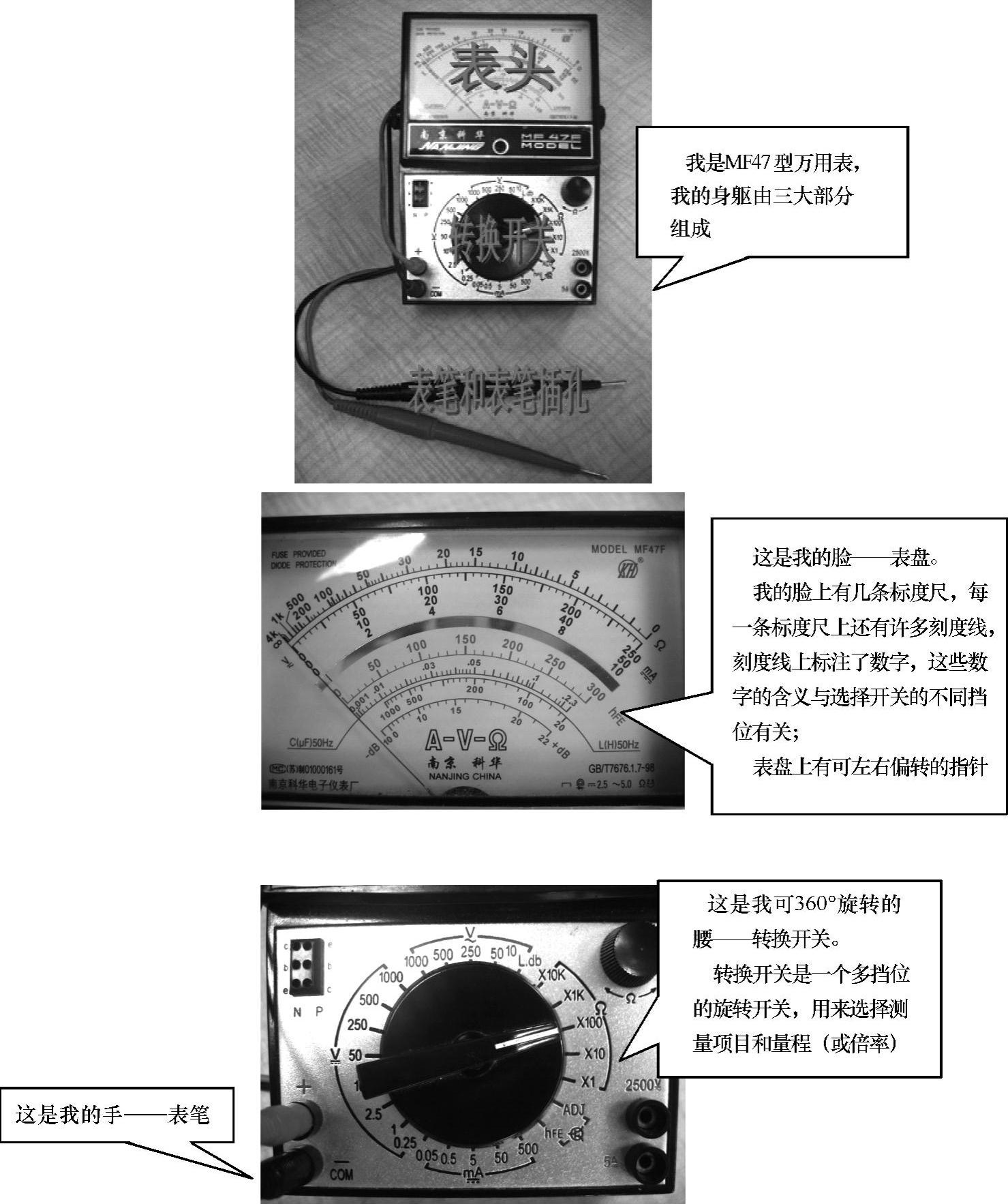 指针式万用表的型号很多,初看起来很复杂,但基本结构是类似的。指针式万用表的外部结构主要由表头、转换开关(又称选择开关)、表笔插孔和表笔等部分组成(见图1-11)。