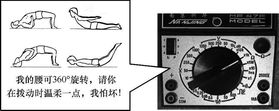拨动转换开关,可以使某一刀与某一位接触,从而接通不同的测量线路,完成选择的测量项目和测量量程(或倍率)。图1-17所示为拨动转换开关时的注意事项。