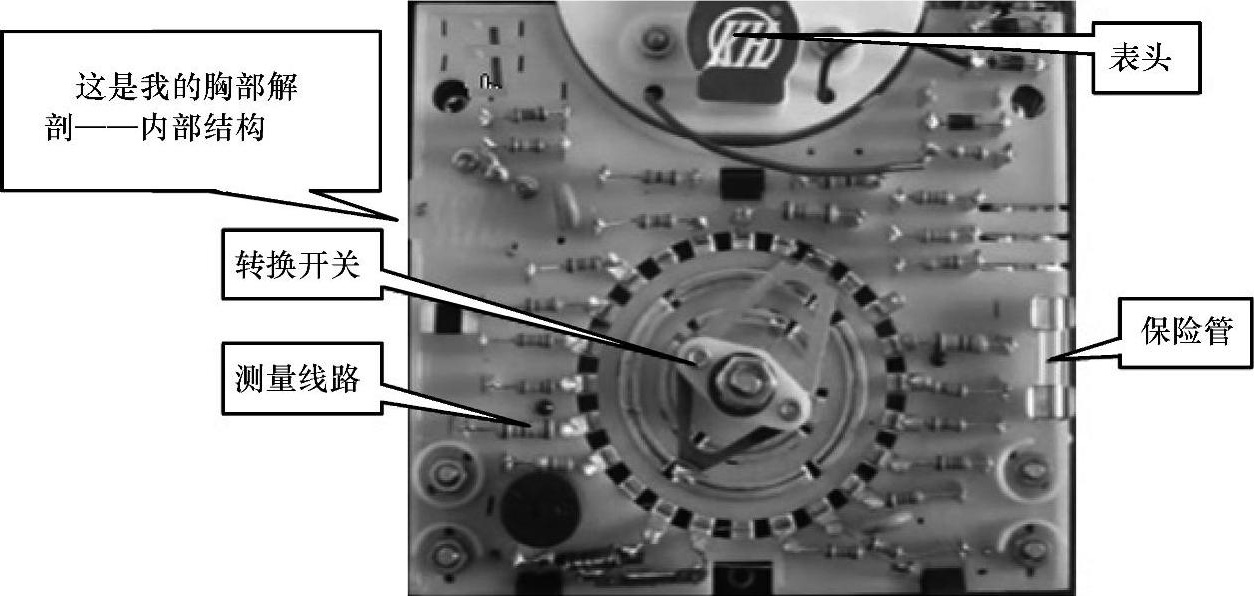 万用表的内部结构(见图1-12)比较复杂,其核心部分是由电阻、二极管等元件组成的测量线路。为了防止使用时误操作损坏测量线路,还设置有保险管。这种处处为使用者着想的结构设计思路,体现出设计者对初学者的关怀。