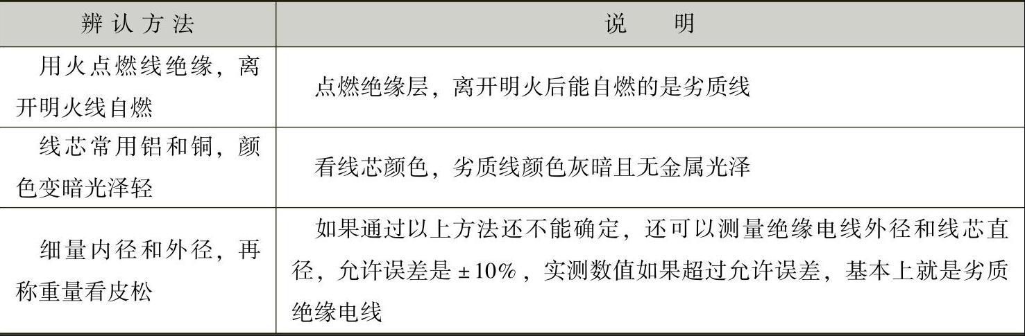 电线不仅关系着家庭正常的日常生活,更关系着家里的安全。劣质电线的绝缘外皮和导体截面积肯定都不合格,会引起绝缘体断裂,使带电导体裸露,极易发生触电危险,会造成短路、停电、损坏电器设备,甚至还会引起火灾等严重后果。有些劣质电线甚至一搓就断,使用这种电线是非常危险的。可采用表1-5的方法快速辨认劣质电线。
