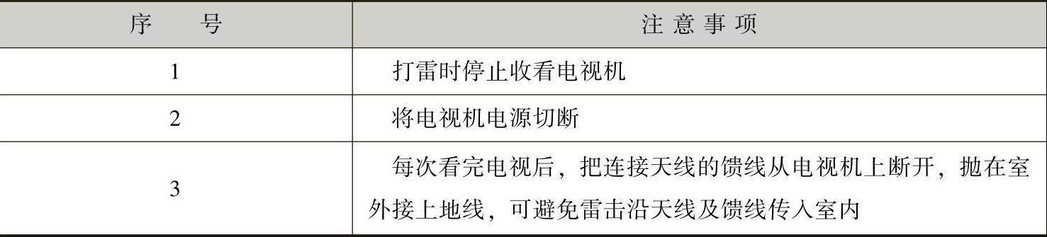 强雷雨天气是一个短时的过程性天气,来势猛、损害大、范围广,所以,在强雷雨天来临时,首先要关好门窗,避免雷电进屋,同时应关闭电视机,并拔掉电源和有线电视插头。电视机防雷注意事项见表1-6。