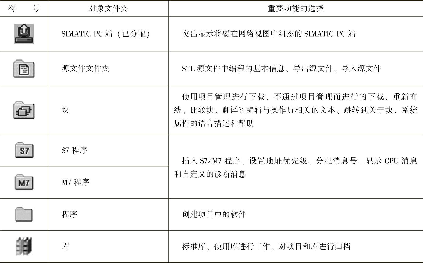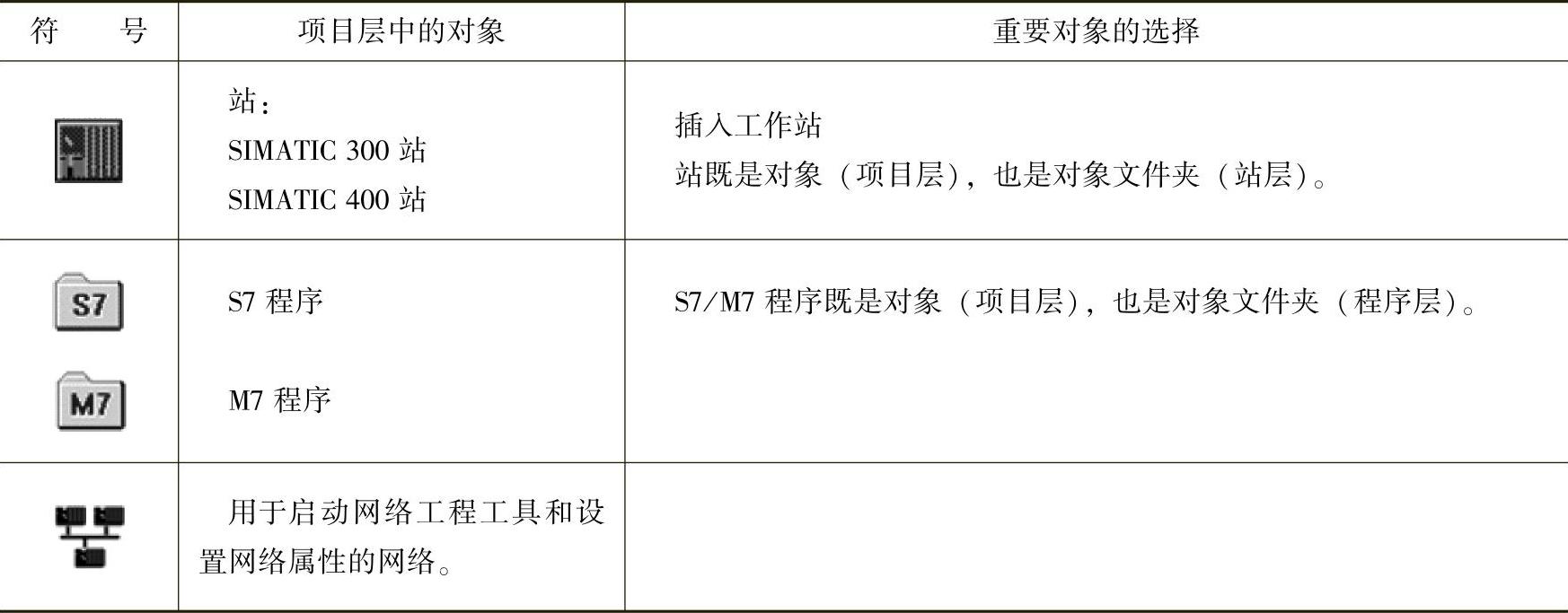 SIMATIC M7模块在对象文件夹中被称为“M7程序”。S7/M7程序既是对象(项目层),也是对象文件夹(程序层)。SIMATIC S7-300/400站表示具有一个或多个可编程模块的S7硬件配置。S7/M7程序文件夹包含了用于S7/M7 CPU模块的软件或用于非CPU模块的软件,如,可编程CP或FM模块的软件。