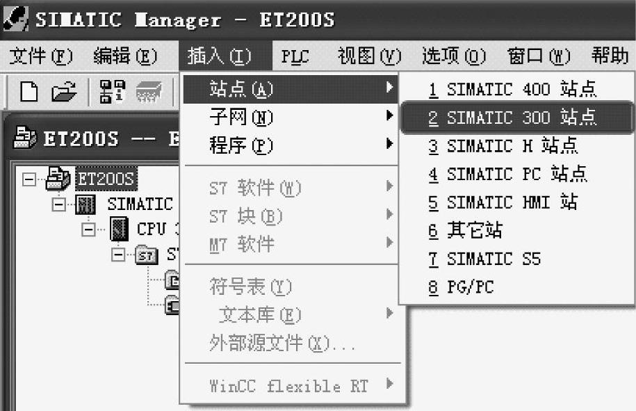 站既是对象(项目层),也是对象文件夹(站层)。在项目中,站代表了可编程序控制器的硬件结构,并包含用于组态和给各个模块进行参数分配的数据。使用“新建项目”向导创建的新项目已经包含有一个站。否则,可以使用菜单命令“插入”→“站点”来创建新站,如图2-24所示。