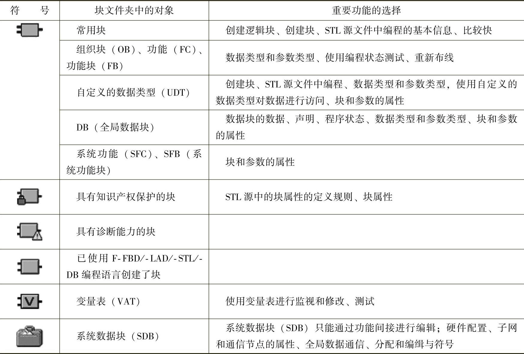 源文件夹包含以不同的编程语言产生的程序的源码。即源文件夹包含了文本格式的源程序。离线视图的块文件夹可包括逻辑块(OB、FB、FC、SFB、SFC),数据块(DB),自定义的数据类型(UDT)和变量表。系统数据对象表示系统数据块。在线视图的块文件夹包括已经下载给PLC的可执行程序部分。