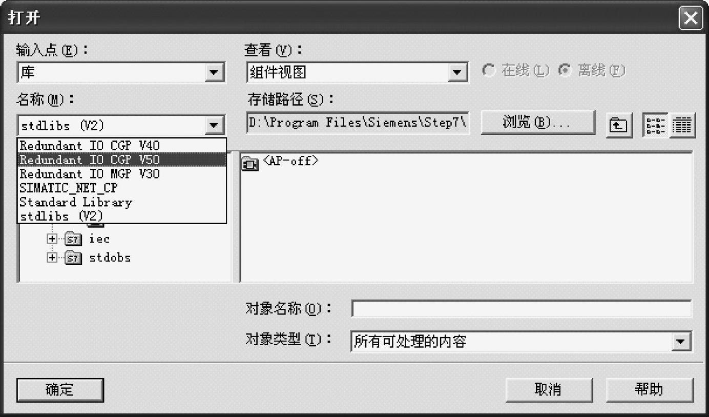 STEP 7包含一个标准库,在安装STEP7软件时,标准库将自动安装在硬盘上,它存放在STEP 7软件文件夹下,如C:\Siemens\Step7\S7libs\stlib30。在SIMATIC管理器下可以通过“文件”→“打开”→“库”访问这些库,“文件”→“打开”后弹出一个对话框,可在其中选择所需的库和项目,如图2-25所示。
