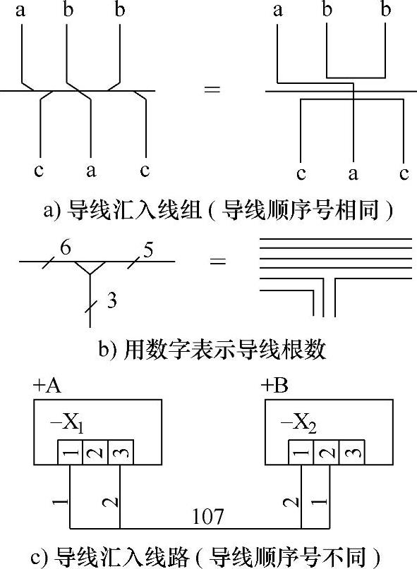 连接线的连续表示法和中断表示法如图1-16所示,汇总线的单线表示法如图1-17所示,中断线的表示法如图1-18所示。