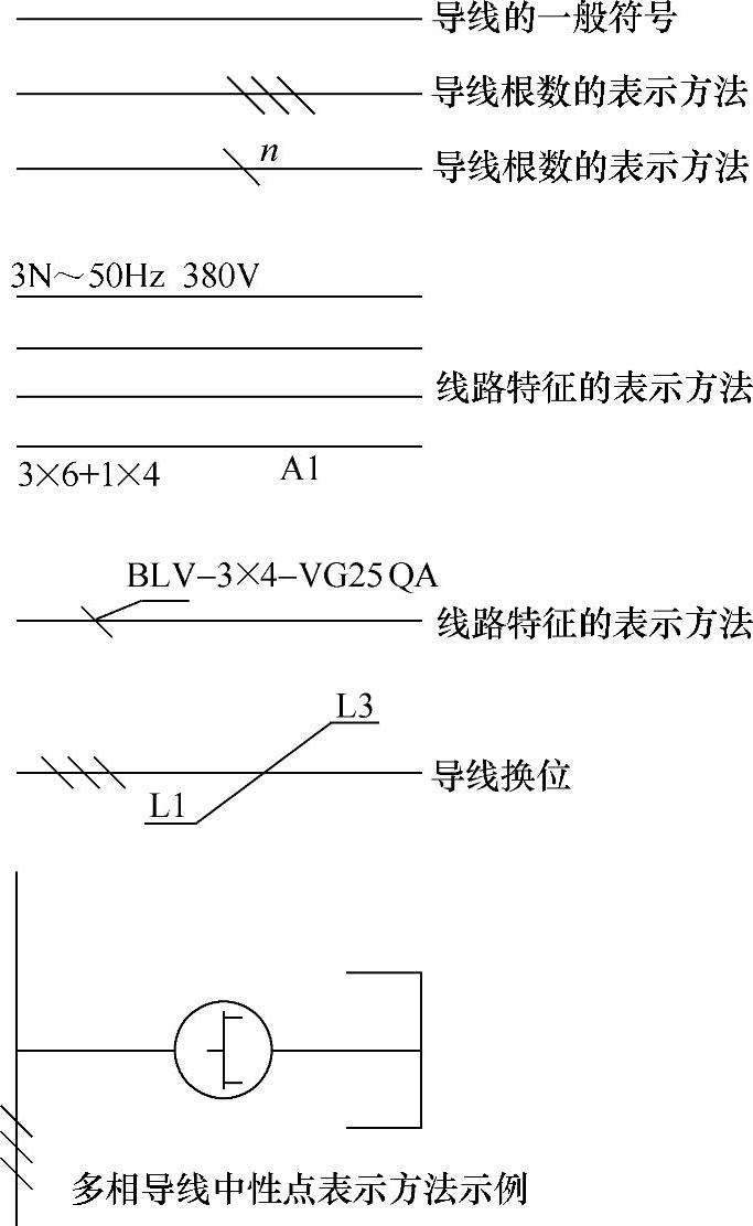 2)导线的特征(如导线的材料、截面积、电压、频率等),可在导线上方、下方或中断处采用符号标注。