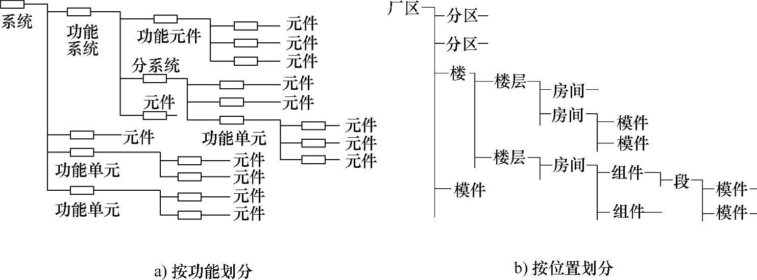 按位置原则划分项目结构,就是按项目之间的位置关系划分项目。例如一个厂的系统可划分为厂区、分区、楼号、层号、房间、组合件、组件段和模块等,如图1-19b所示。