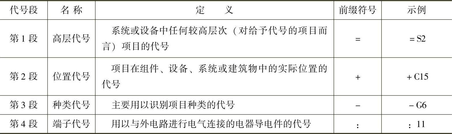 项目代号由高层代号、位置代号、种类代号、端子代号根据不同场合的需要组合而成,它们分别用不同的前缀符号来识别。完整的项目代号包括四个相关信息的代号段,每个代号段都用特定的前缀符号加以区别。