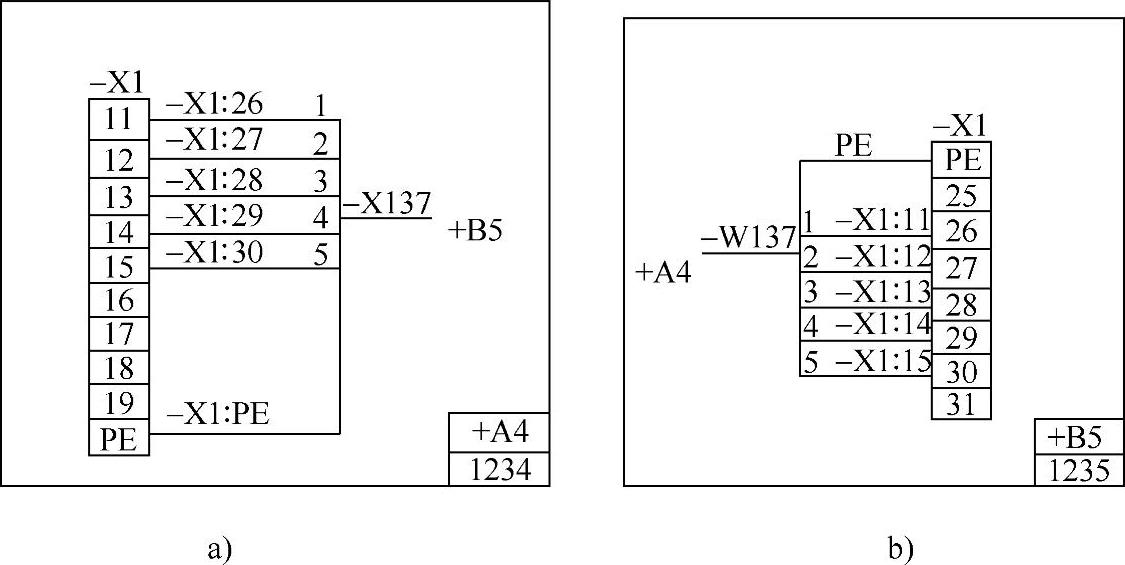 一个项目代号可以由一个代号段组成,也可以由几个代号段组成。通常,种类代号可以单独表示一个项目,而其余大多应与种类代号组合起来,才能较完整地表示一个项目。例如,图1-20a中各端子代号为“-X1∶26”、“-X1∶27”…,电缆-W137的相应芯线接到远端+B5-X1的端子26~30及PE上,如图1-20b所示。