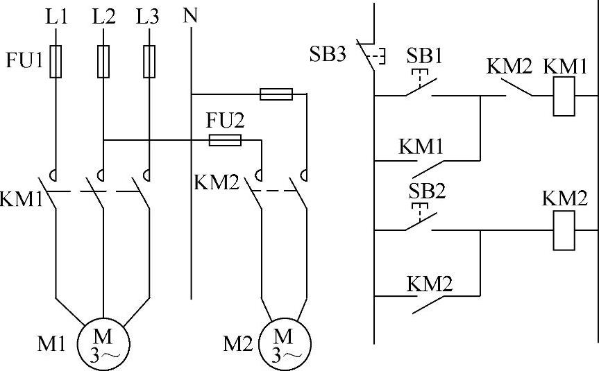 图2-4所示为两台电动机互锁电路原理图,采用的集中式表示法,主要用于说明电动机M1和电动机M2供电、控制及互相联锁的电路构成和工作原理。