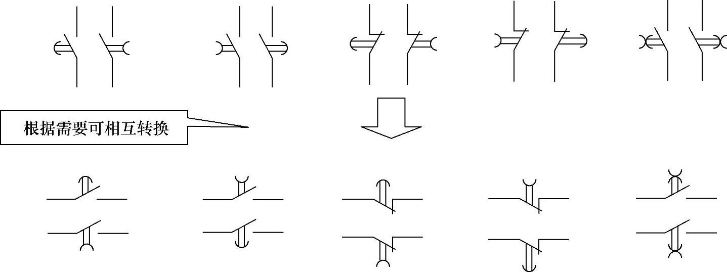 半集中式表示法适用于内部具有机械联系的元器件。机械连接线可以是直线,也可以是折弯、分支和交叉,如图2-5所示。