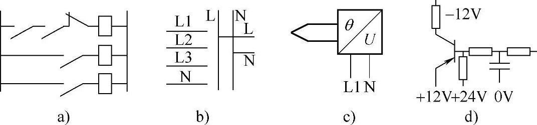 6)对于公用的供电线(例如电源线等),可用电源的电压值来表示,如图2-8d所示。