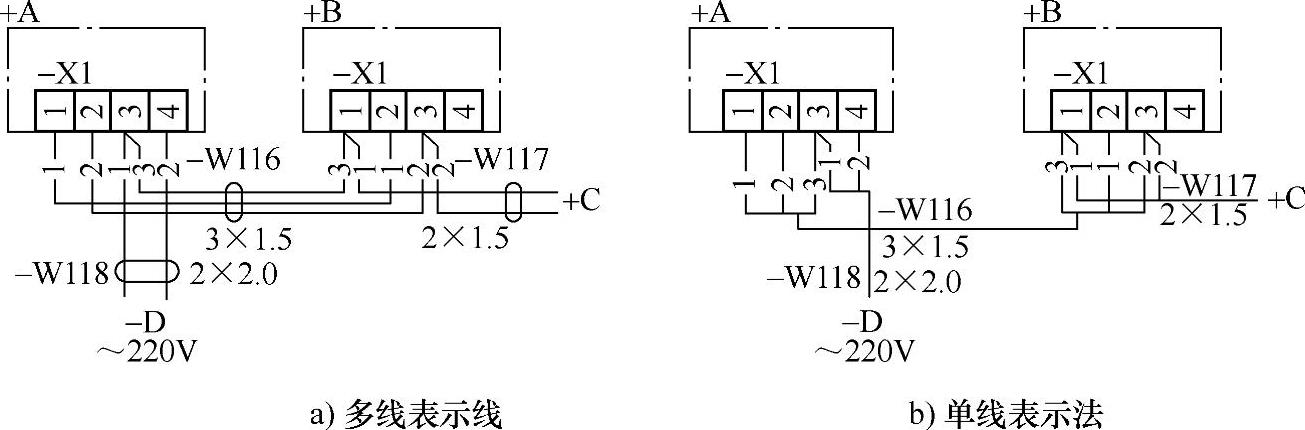 在单元接线图中,导线采用编号进行标注,如图2-10所示。其中,图2-10a为连续线段的表示方法,图2-10b为导线束的表示方法,图2-10c为中断线的表示方法。