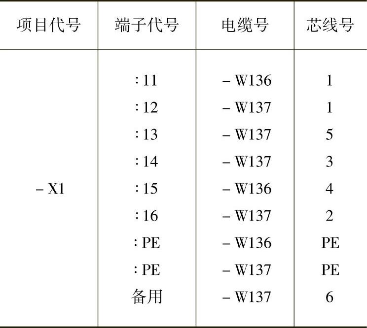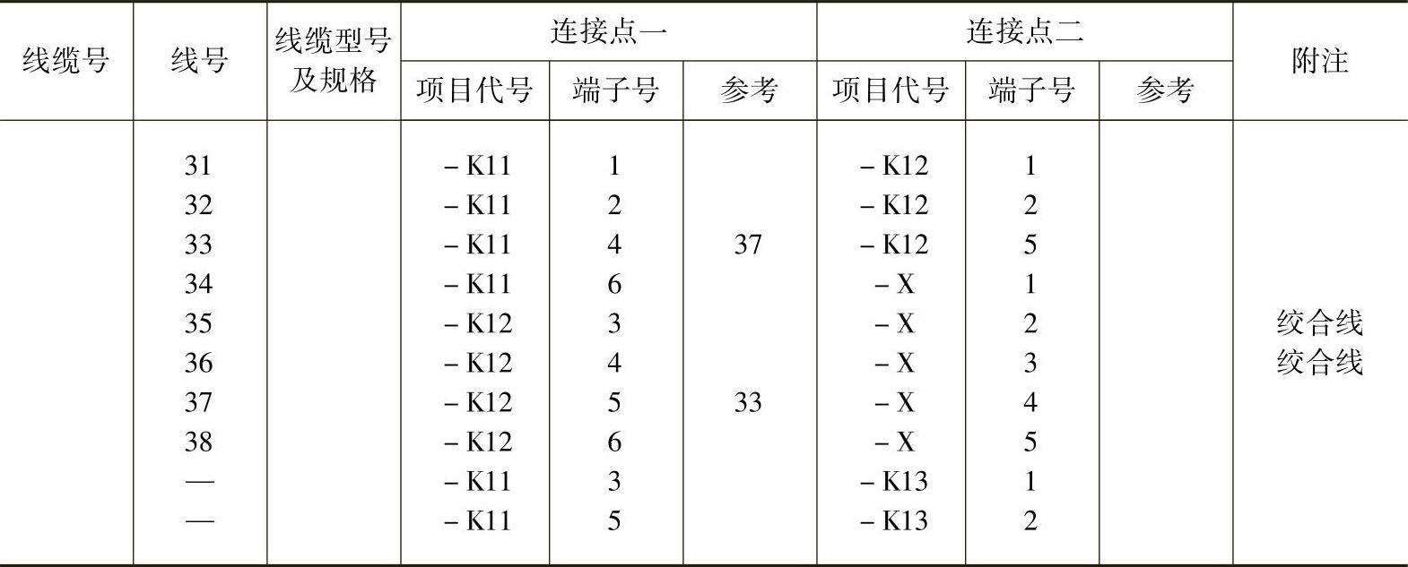 单元内部的连接关系也可用单元接线表来表示。表2-7就是根据图2-10所示的单元接线图列出的单元接线表,它是按照连接线号顺序排列的。该表共有十根连接线。其中—K11和—K13之间的两根连接线很短,没有编号,其余的八根连接线采用独立标记法进行编号,按顺序编为31~38。项目—K12的第五个端子同时连接线号为“33”和“37”的连接线。线号为33的连接线的“参考”栏内标有数字“37”,其含义为可参考线号为37的连接线。由线号为33和37的两根连接线所连接的端子,是一个共同的接线端子,即—K12的第五号端子。